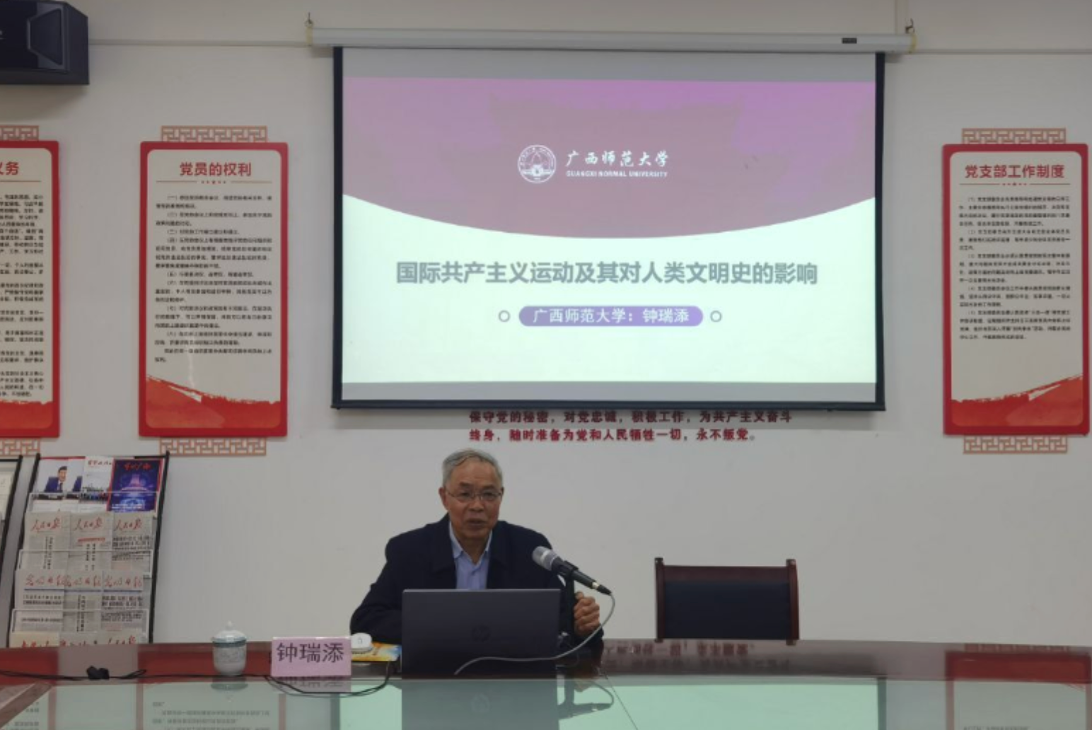 为纪念马克思逝世143周年,深切缅怀革命导师,汲取马克思主义真理力量,3月13日下午,我校特邀请广西“八桂学者”、广西师范大学原副校长、二级教授、博士生导师钟瑞添为我校教师作题为《国际共产主义运动及其对世界人类文明史的影响》专题学术报告。学校党委书记蹇兴超出席报告会。学校全体思政课教师以及兄弟院校思政课教师代表参会。